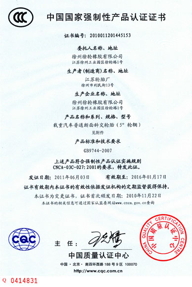 質(zhì)量是企業(yè)的生命,是企業(yè)得以生存和發(fā)展的基礎(chǔ)。公司自2006年創(chuàng)辦以來,徐輪橡膠就是一直對(duì)產(chǎn)品品質(zhì)孜孜以求,精益求精。以“質(zhì)量是生命 科技求領(lǐng)先 過程零缺陷 服務(wù)到永遠(yuǎn)”為質(zhì)量方針,徐州徐輪橡膠有限公司建立健全了科學(xué)完善的質(zhì)量保證體系,自2009年起先后通過了ISO9001-2008、CCC、美國DOT、歐洲E-mark等質(zhì)量體系認(rèn)證。